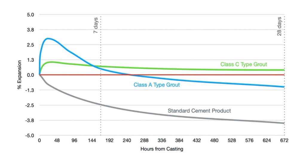 Successful shrinkage compensation coincides with each phase of shrinkage. In other words, the magnitude of expansion and the timing of occurrence should be equivalent to the predicted shrinkage for each stage of the grout or concrete’s life. To achieve shrinkage compensation, we use a variety of techniques and products.