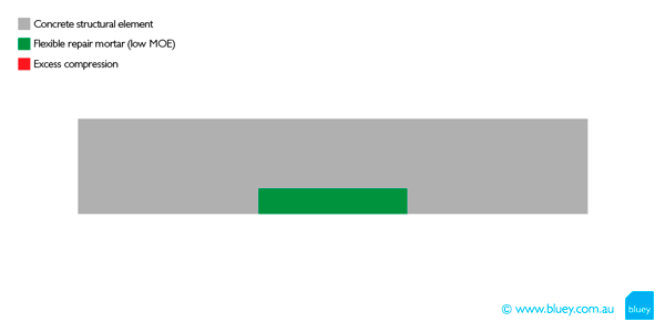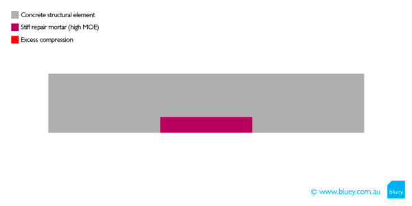 In each case, the structure responds completely differently to the original design and develops unexpected areas of stress outside of the repaired area. For these reasons, it is critical that the repair material deforms under load similarly to the original concrete. This is why MOE is such an important material property. Typically the specified modulus of elasticity of concrete would be left up to the Engineer to decide but for general repairs, we would aim for a MOE of with 5-10GPA of the host material.