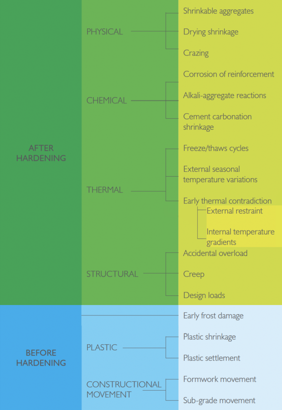 The first step is to determine which type of crack is present. These cracks can be broken down into 6 categories which are triggered by a multitude of causes. Figure 1, highlights the relationship between these types of cracks and their causes.