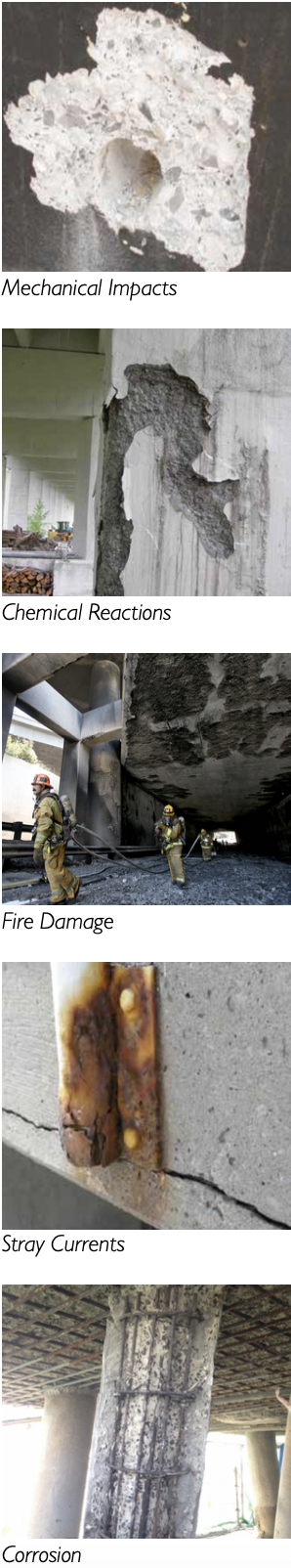 Most mechanical failures occur because of physical impacts such as collisions. Vibrations, overloading and other movements can also result in cracking and loss of entire concrete sections.